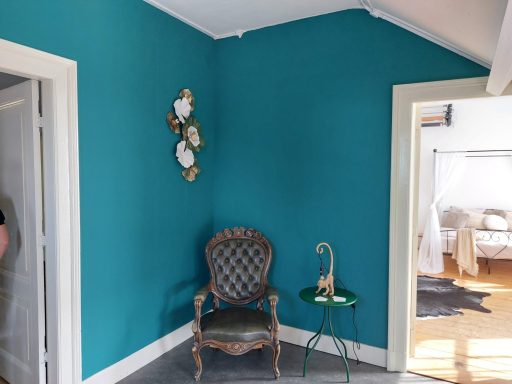 - een industriële ruimte met aan de andere kant een turquoise muur